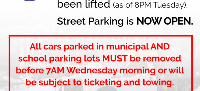 PARKING BAN: Effective at 10:00 AM tomorrow, Tuesday, March 14th, until 7:00 AM Wednesday, March 15th all vehicles are banned from parking on city streets. Residents may park in all municipal and school parking lots. Please remove all vehicles from municipal and school parking lots before the parking ban expires at 7:00 AM Wednesday. School parking lots will be the first areas to be ticketed and towed once parking ban has concluded.Violators of this emergency declaration will be at the owner’s expense.