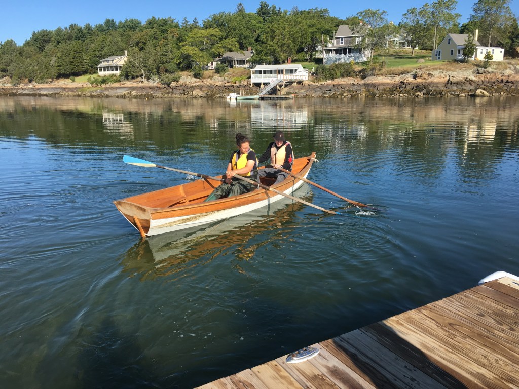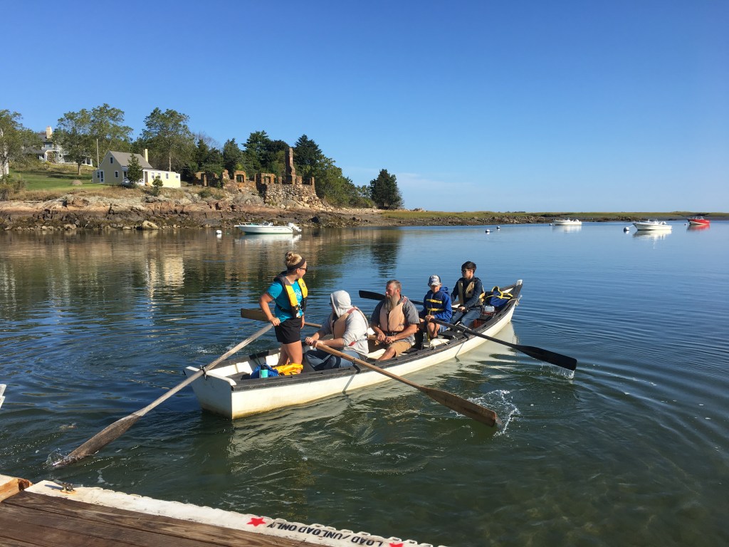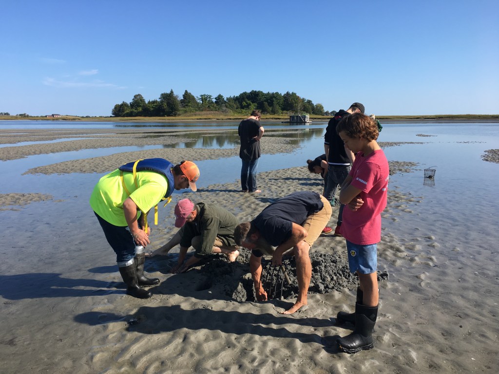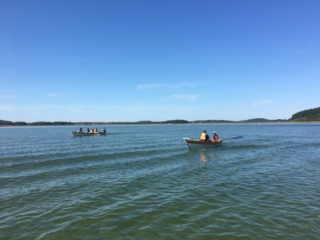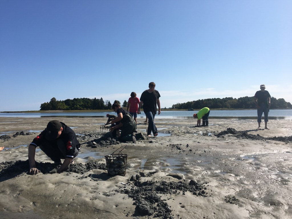 The Essex Shipbuilding Museum took a group of students, from Topsfield Vocational Academy, that built the clamming skiff on a trip last Friday. They left from Conomo Point and rowed the clam skiff, with two of the museums fleet of Sharptown barges to two clam flats (Seal Bank and Town Nub), where the students learned how to clam with a fork and by hand. Their teacher Mark Webster and professional clammer and project partner Ian MacDougall, of Hermit Crab Industries, showed the students how to harvest the clams. When they had dug enough clams (soft-shell and razor), they had a clambake on the flats followed by a row back to Conomo Point. A great way to end a tremendous project, they built the boat and then put it to work.
