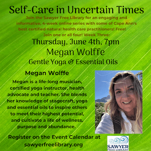 Join the Sawyer Free Library for their weekly series of programs for easy self-care for these uncertain times. Led by some of Cape Ann’s best natural health care practitioners, learn simple ways to help ease stress, tips for better sleep, and better nutrition. These programs offer a free and engaging opportunity to come together, learn and have fun while doing it.