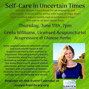 Join the Sawyer Free Library virtually for the fourth in their Self-care in Uncertain Times Series. GRETA WILLIAMS, Lic. Acupuncturist on Thursday, JUNE 11 at 7:00pm will be teaching simple and effective acupressure and some Chinese herb basics.