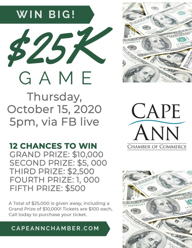 Cape Ann Chamber of Commerce’s Annual $25K Game, Tickets are Available! Image ~ September 18, 2020 ~ Greater Cape Ann Chamber of Commerce Share this: Click to share on X (Opens in new window) X Click to share on Facebook (Opens in new window) Facebook Like Loading...
