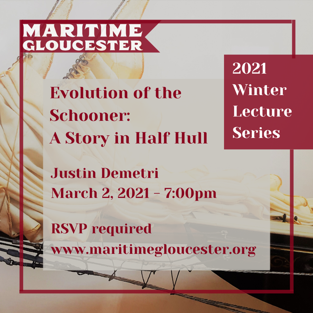 We kick off the series on March 2, 2021 with Maritime Gloucester’s own Justin Demetri presenting Evolution of the Schooner: A Story in Half Hull. Presentation and Q&A to follow.