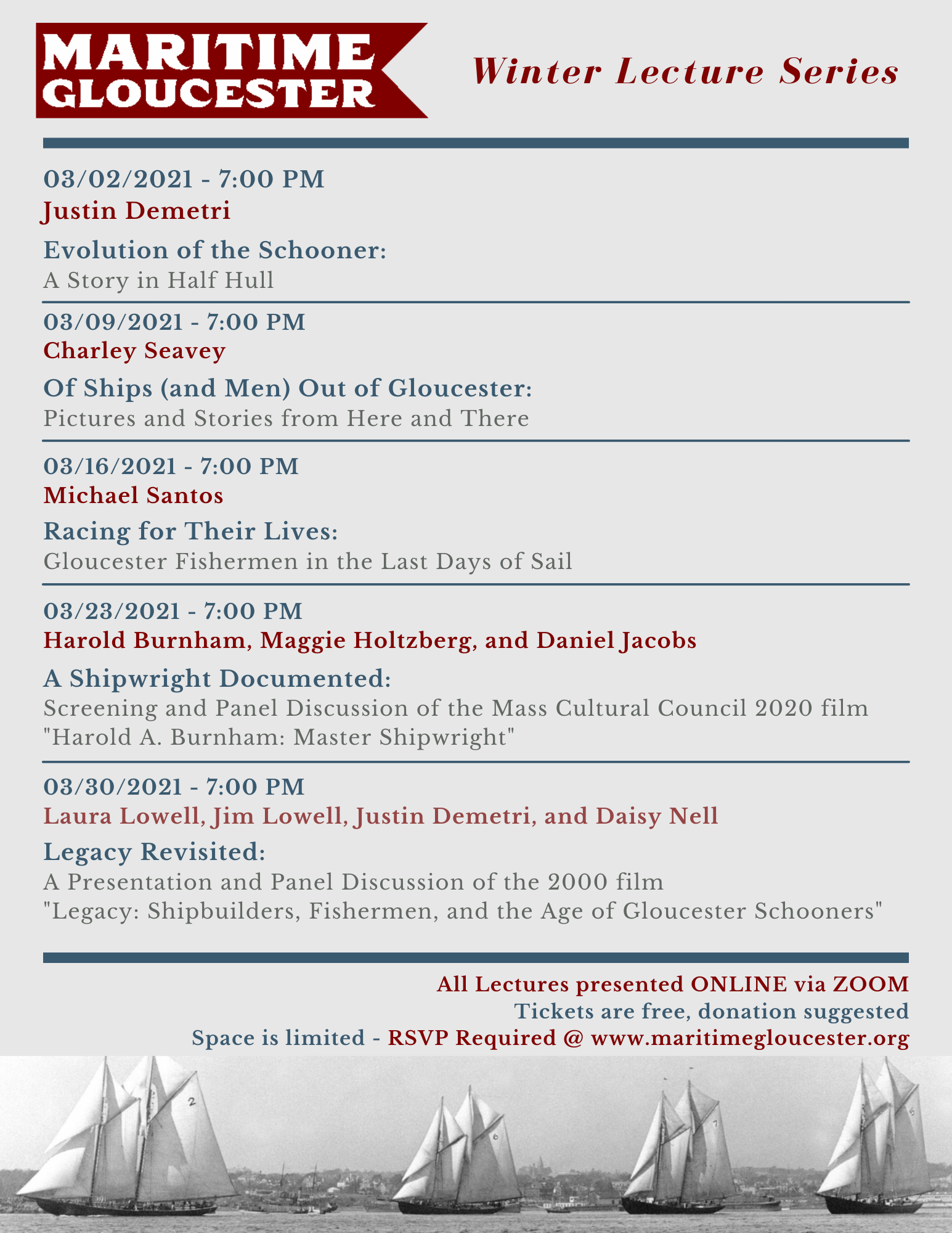 The Maritime Gloucester 2021 Winter Lecture Series goes virtual every Tuesday this March! This year’s roster focuses on the iconic vessel that defines our heritage and captures our hearts: The Schooner. With discussions of design, glimpses from past harbors, tributes to the fishing fleet and the men that drove it, and current legends that carry on the tradition…this lecture series goes in-depth with five entertaining and informative sessions.