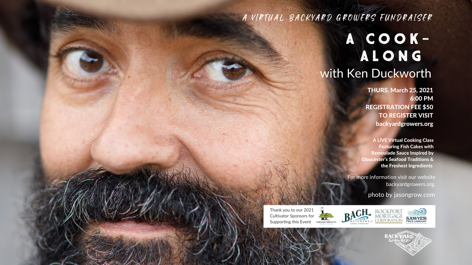 Join us for a LIVE virtual cook-along and fundraiser for Backyard Growers with Ken Duckworth. Ken is a renowned local chef and restaurateur. Since landing in Gloucester from Boston 16 years ago to open Duckworth’s Bistrot, Ken and his wife Nicole have created community at their restaurant through their relationships with their customers and partnerships with local farmers, fishers, and makers.