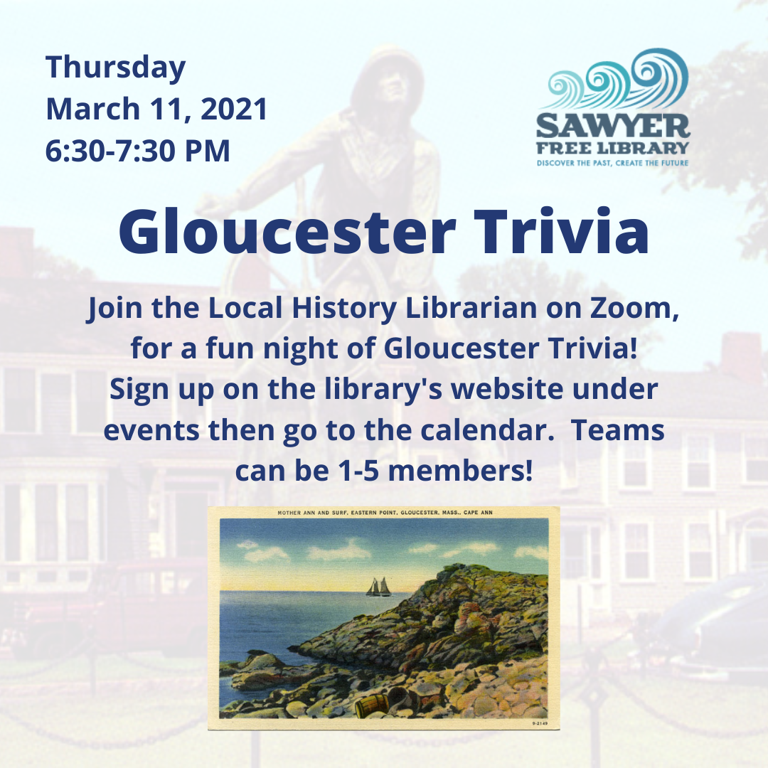 Get a team together and join the Sawyer Free Library Local History Librarian on Zoom for a fun night of Gloucester Trivia on Thursday, March 11 from 6:30-7:30pm! Sign up at here! Teams can be 1-5 members!