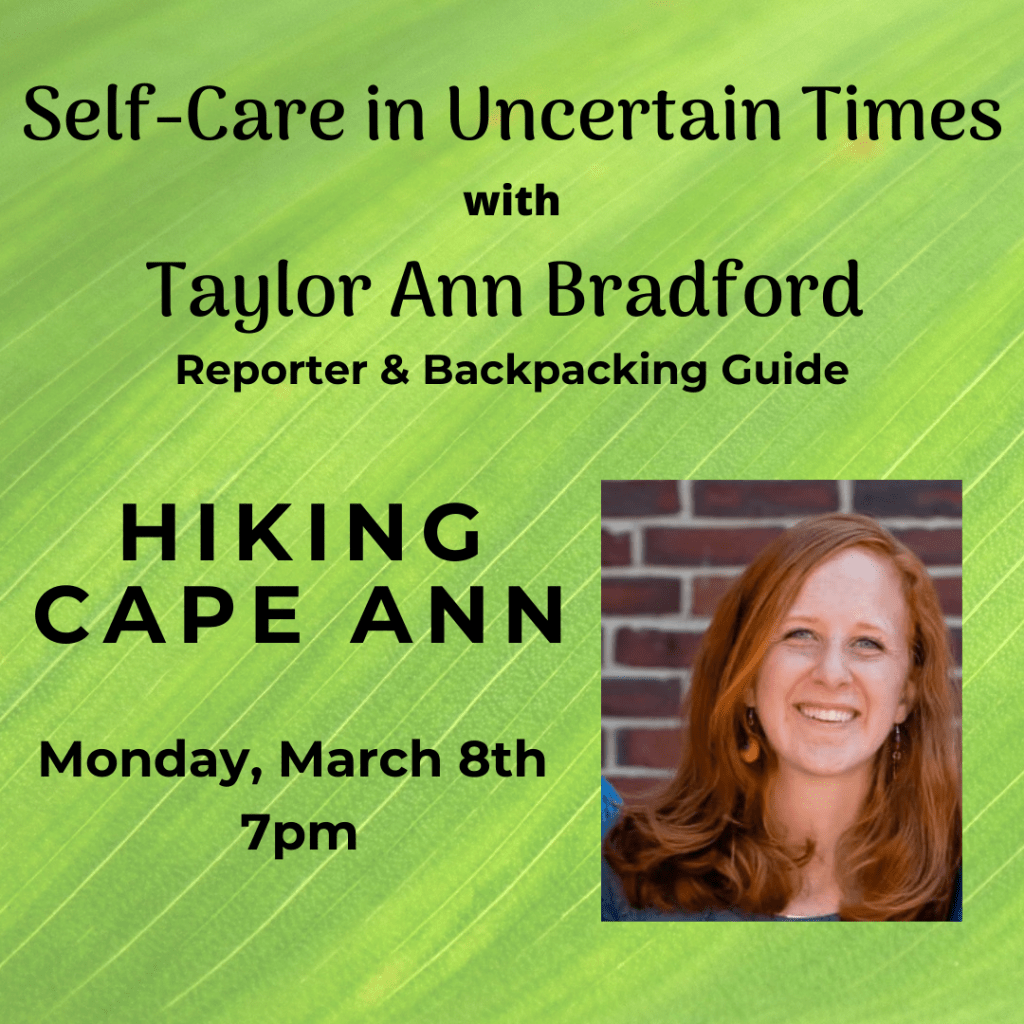 Join the Sawyer Free Library on Monday, March 8 from 7-8pm when Taylor Ann Bradford, local reporter, certified backpacking guide and author of the weekly column: Woods to Writing Desk, will share her favorite hiking trails throughout Cape Ann, give tips on best practices and share some of her favorite tales from the trails. Registration is required for this fun and engaging live Zoom program, space is limited. Register here.
