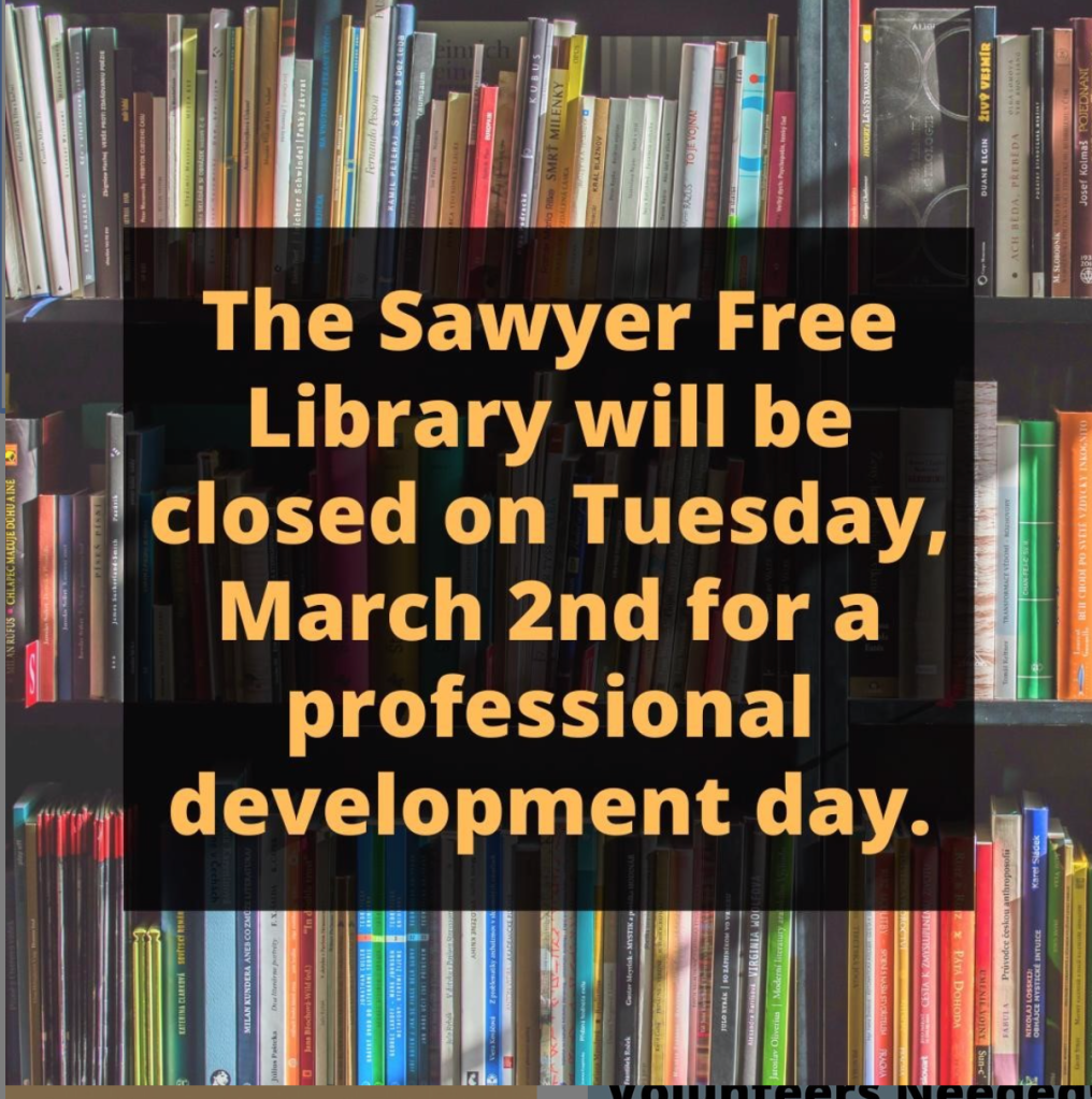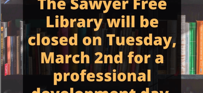 The Sawyer Free Library will be closed on Tuesday, March 2nd for a professional development day.