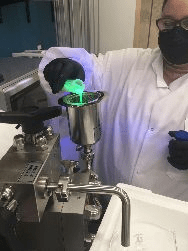 In the second semester students learn how to insert DNA necessary to create green fluorescent protein (GFP) into bacteria. The bacteria are then grown into high density in a fermenter, producing equally high concentrations of GFP inside the bacteria. In the image shown above, a student learns how to successfully operate a homogenizer, an instrument used to break open bacterial cells and release the GFP, which is glowing after being exposed to a UV light source.