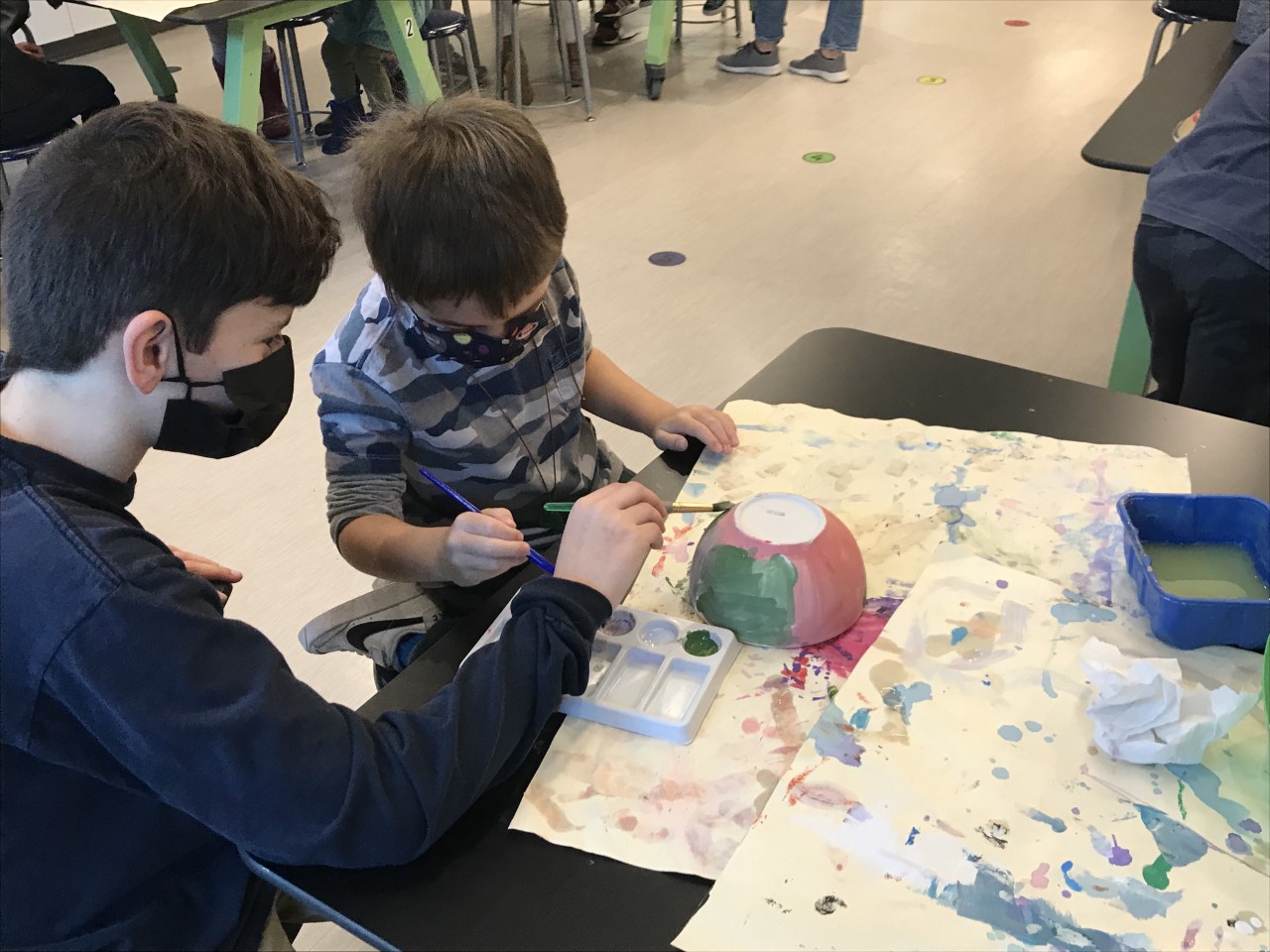 Manchester Memorial fourth grade student Miles Harrison helps preschool student Quinn Reishtein paint a bowl. (Photo Courtesy of Claudette Yutkins)