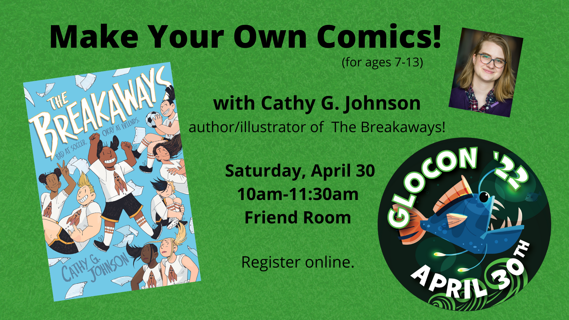 10:00 – 11:30 a.m. Make Your Own Comics! Come have fun while drawing your own comics! In this workshop, students will play silly drawing games, generate ideas for their own characters, and start to write their own comic book stories. All levels of experience are welcome! The workshop is run by Cathy G. Johnson, Providence-based writer and artist of the graphic novel The Breakaways. REGISTER HERE.