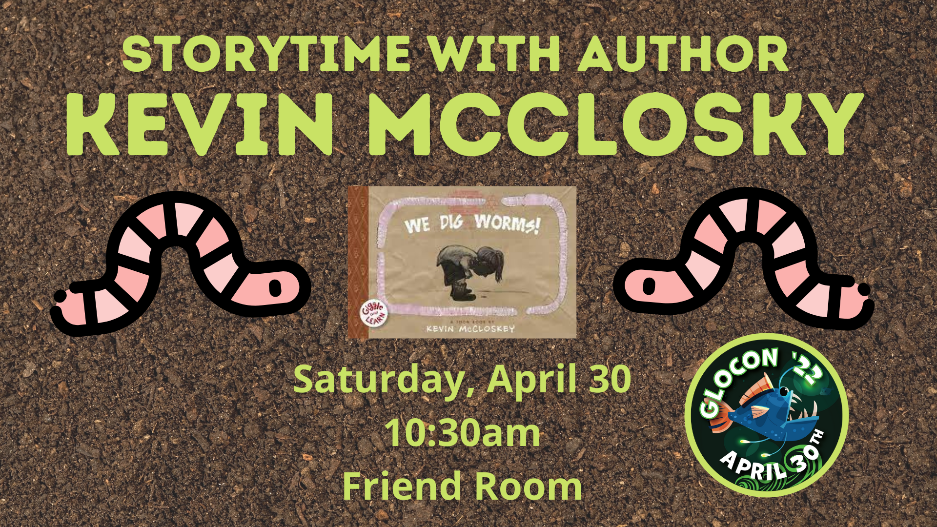 10:30 a.m. – Storytime: We Dig Worms – Young children and their families can enjoy a fun science-filled story time with author and illustrator Kevin McCloskey. No registration needed.