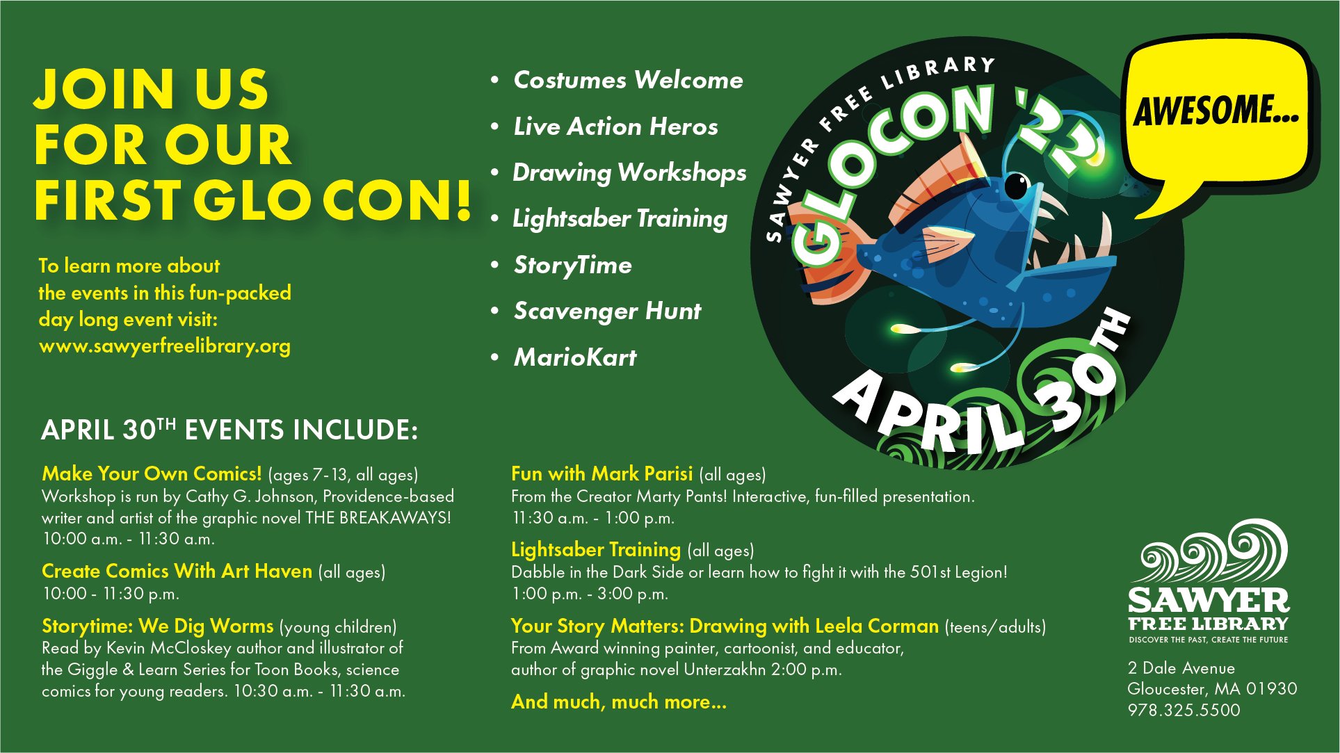 Come check out Sawyer Free Library‘s first annual comic con event, Glo Con on Saturday, April 30 from 10am – 3pm! We’ve got artists, authors, crafts, workshops, cosplayers, snacks, a photo booth, MarioKart on the big screen, and other superhero/comics/graphic novel activities all fun for the whole family! Visit: SawyerFreeLibrary.org for all the details!