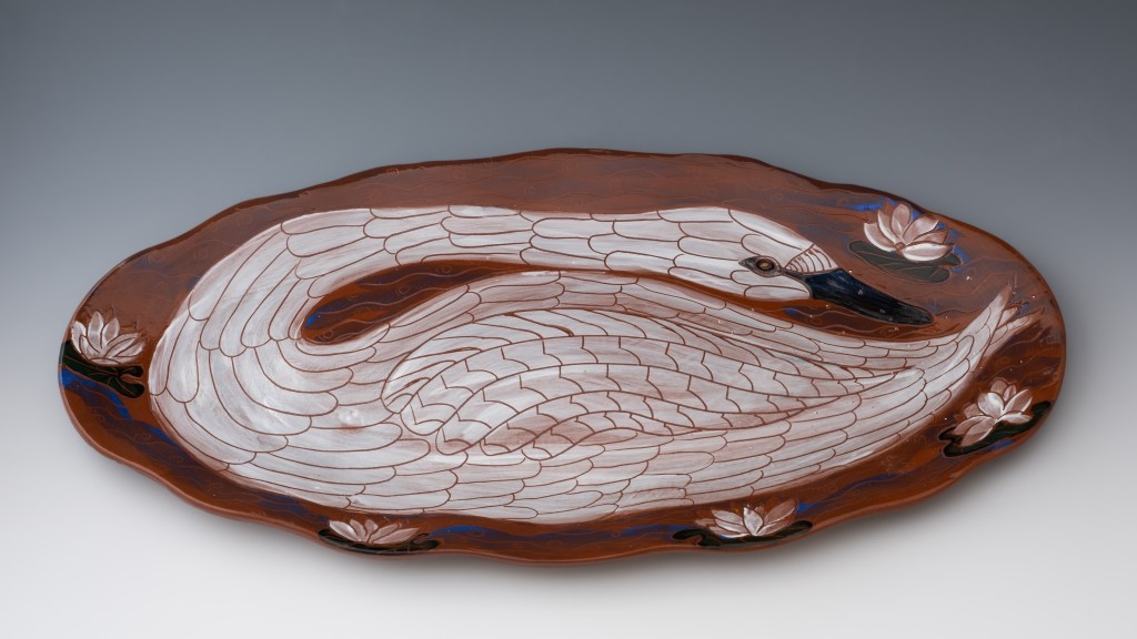 “Swan Platter” by Evelyn Stewart is available for bid through The Open Door Empty Bowl 2023 online auction.