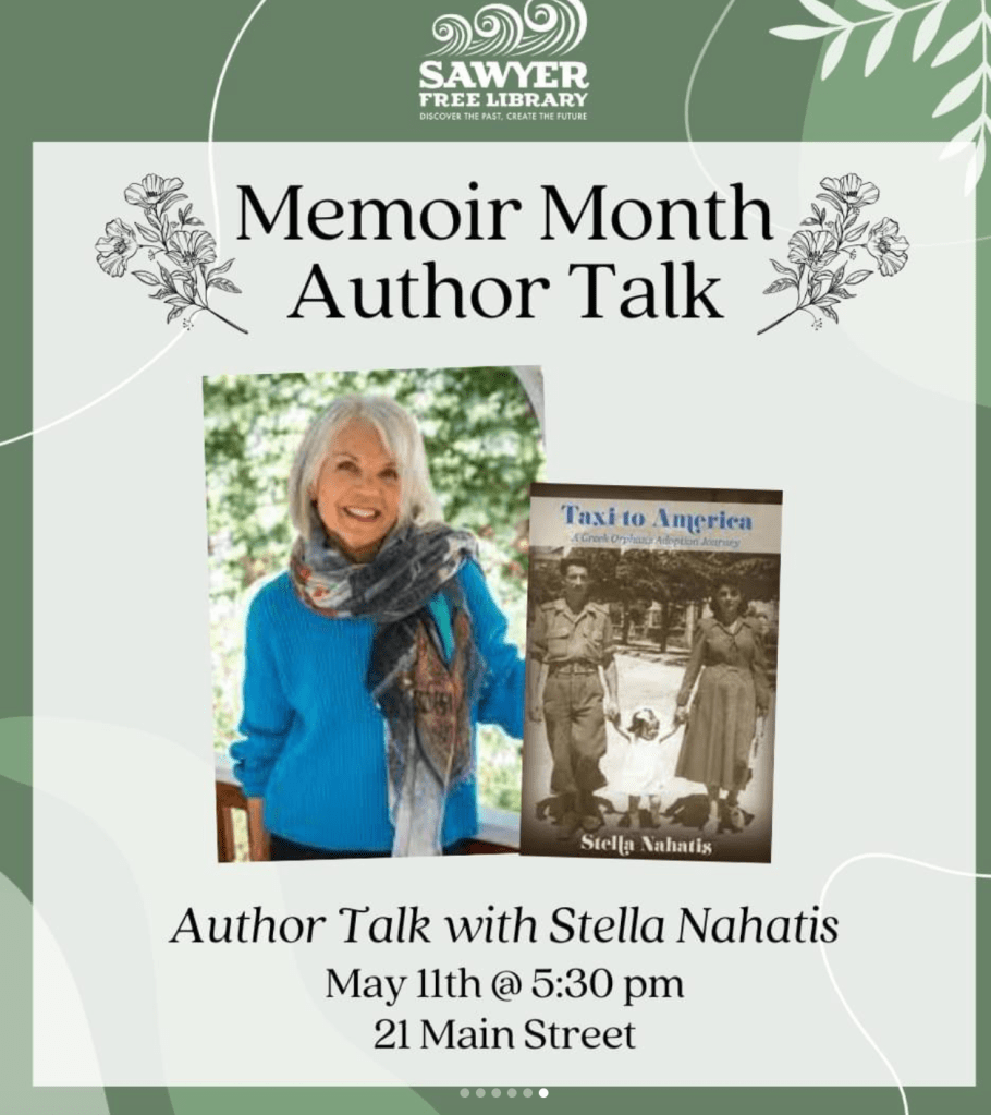 As a part of May’s Memoir Month, the Sawyer Free Library is pleased to welcome local author Stella Nahatis on Thursday, May 11 at 5:30 to discuss her newly released memoir, Taxi to America: A Greek Orphan’s Adoption Journey. All are welcome to attend this special event at the Library located at 21 Main Street in downtown Gloucester.   To register click HERE or for more information, visit, sawyerfreelibrary.org.