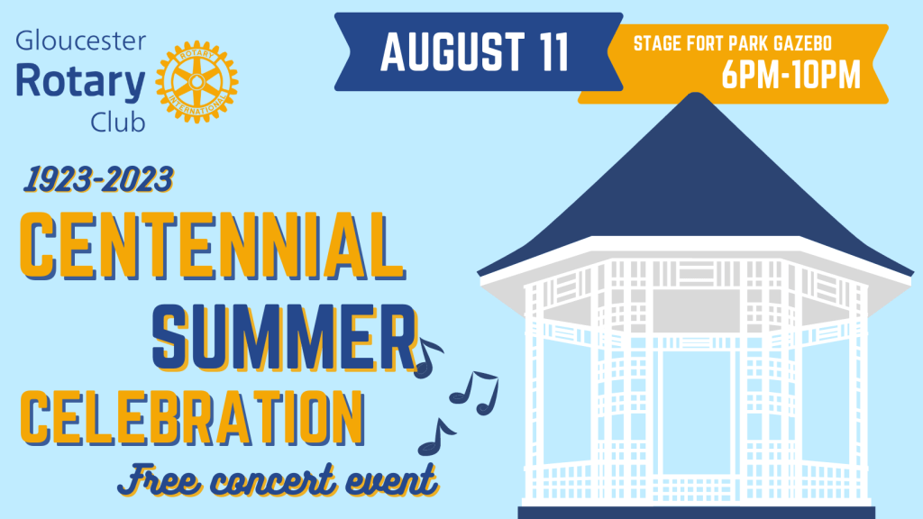 To celebrate their Centennial Anniversary, the Gloucester Rotary will host a free Community Concert with musical guests Captain Jack & The Strangers (The Northshore’s Premier Billy Joel Tribute Band) and opener Brandon Blatchford & the Wannabe Teenagerson on Friday, August 11, 2023, 6-10pm at the Antonio F. Gentile Bandstand in Stage Fort Park.