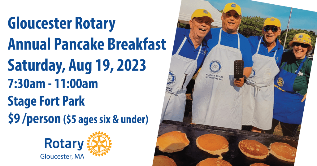 The Rotary Club of Gloucester MA will hold its annual Pancake Breakfast Fundraiser on Saturday, August 19, 2023, from 7:30 a.m. to 11:00 a.m. in Stage Fort Park, located on Hough Avenue in Gloucester, MA. This popular event takes place concurrently with the Gloucester Waterfront Festival, which is sponsored by the Greater Cape Ann Chamber of Commerce and is held in Stage Fort Park on Saturday-Sunday, August 19-20, from 10:00 a.m. to 6:00 p.m. both days. A special free parking area is available for Pancake Breakfast attendees.