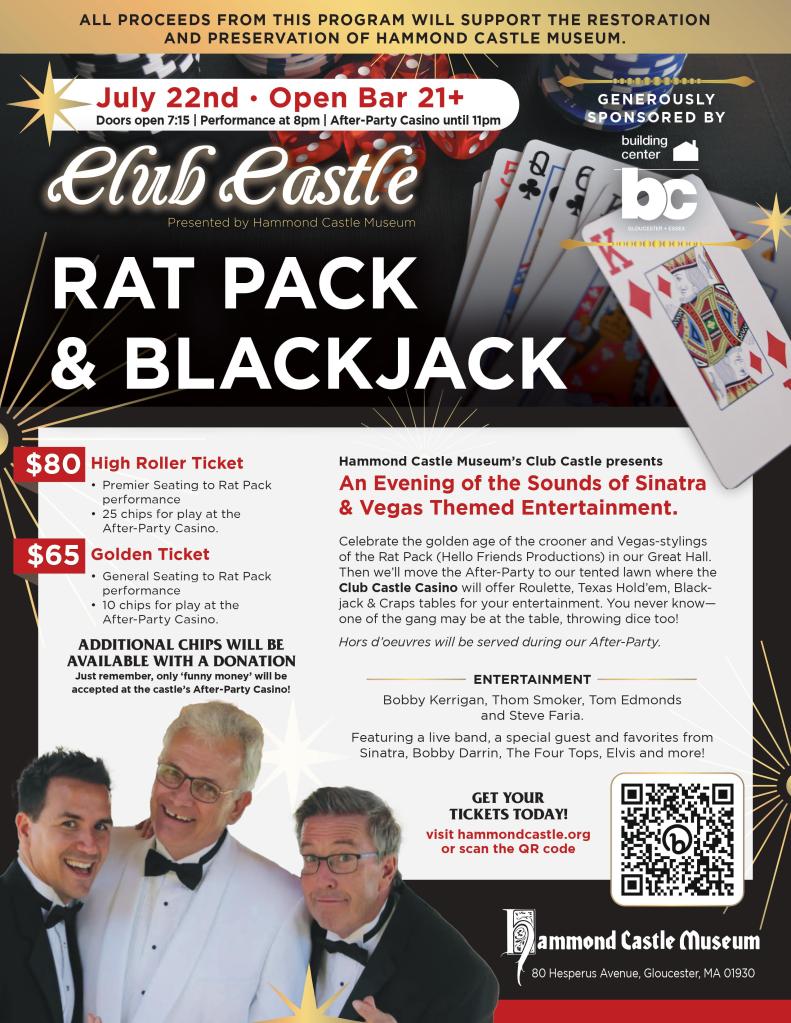 Join us on Saturday, July 22nd and celebrate the golden age of the crooner and Vegas-stylings of the Rat Pack (Hello Friends Productions) in our Great Hall. Starring: Bobby Kerrigan, Thom Smoker, Tom Edmonds and Steve Faria. Featuring a live band, a special guest and favorites from Sinatra, Bobby Darrin, The Four Tops, Elvis and more!