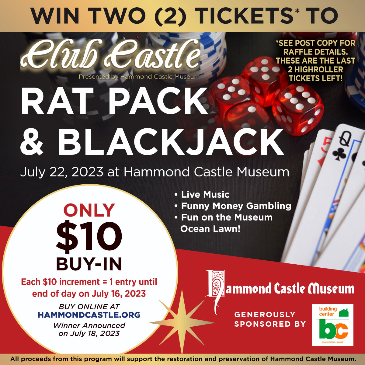 Purchasing Raffle Entries: There are two methods of entering the Raffle: (1) in person in the Museum Shop and (2) online at bit.ly/RaffleRatPackBlackjack. Entry, regardless of the method, is void outside of Massachusetts and where prohibited by law, rule, or regulation. Eligibility: You must be 21 years of age or older to enter. The following persons are NOT ELIGIBLE to participate in the raffle or to win the prize: employees, officers, directors, shareholders, members, agents, and consultants of the Hammond Castle Museum. Raffle Tickets are non-deductible and no portion of the Raffle ticket price may be deducted as a charitable contribution for federal income tax purposes. The raffle prize may not be exchanged for a cash payout of any value.