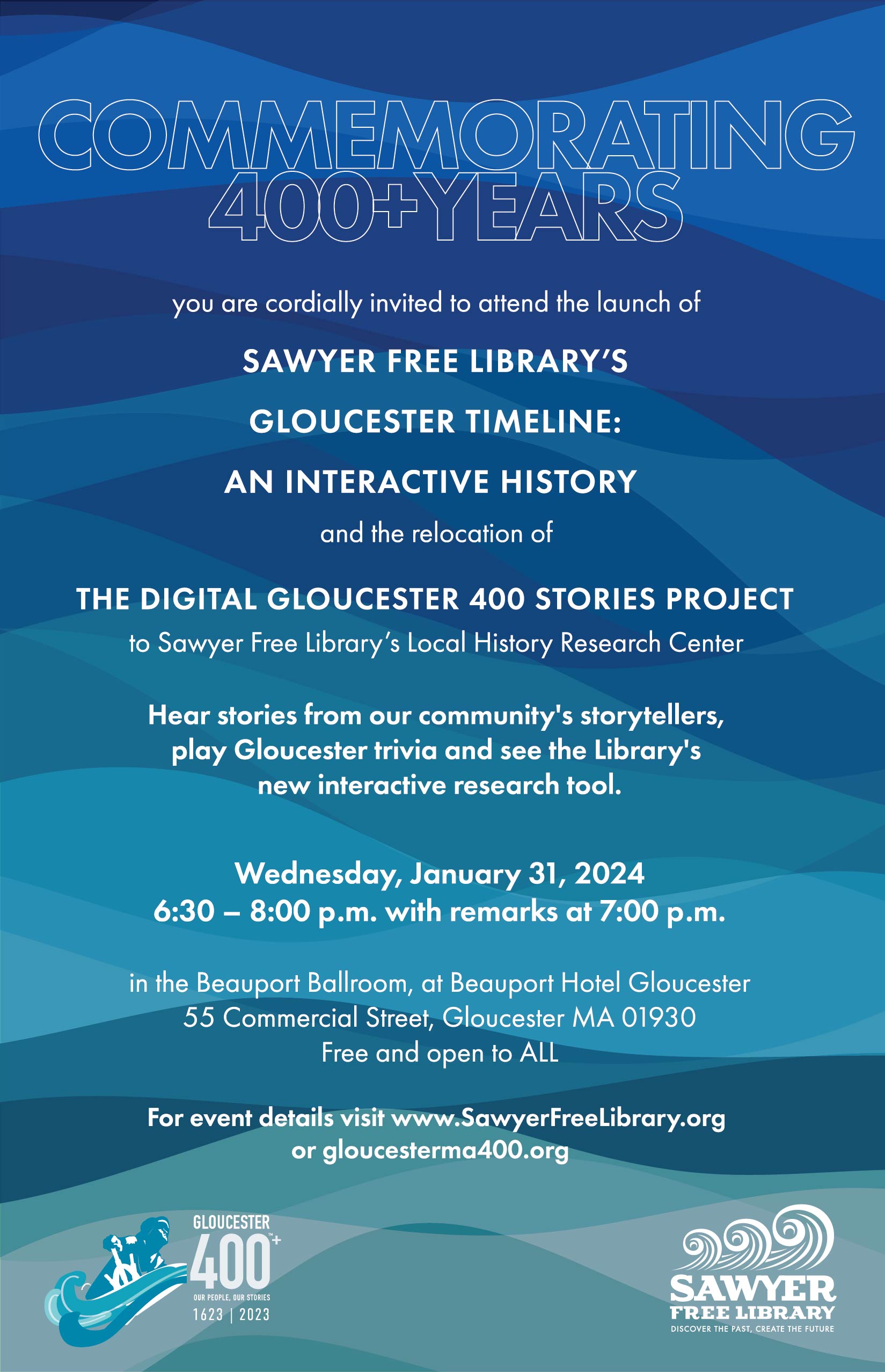 Mark your calendars! Sawyer Free Library & Gloucester 400+ Celebration on Jan 31 at Beauport Hotel – All Are Invited!