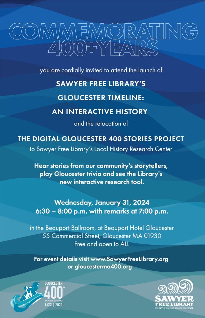 Please join the Sawyer Free Library and the Gloucester 400+ on Wednesday, January 31 from 6:30 to 8:00 p.m. at the Beauport Hotel Gloucester to celebrate the launch of the Gloucester Timeline: An Interactive History and the relocation of the digital Gloucester 400 Stories Project to the Library.