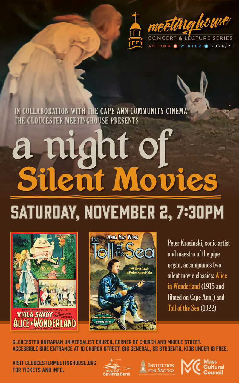 ‘ALICE IN WONDERLAND’ AND ‘TOLL OF THE SEA,” A NIGHT AT THE SILENT MOVIES WITH PETER KRASINSKI ON THE 1893 PIPE-ORGAN IN THE HISTORIC GLOUCESTER MEETINGHOUSE