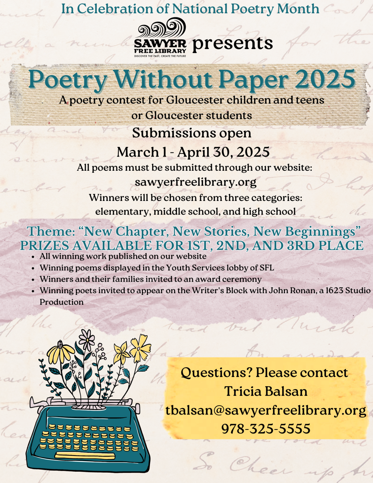 REMINDER – this Wednesday, April 30th is the last day for all local youth poets to submit entries for this year’s Poetry without Paper contest! Enter today HERE!