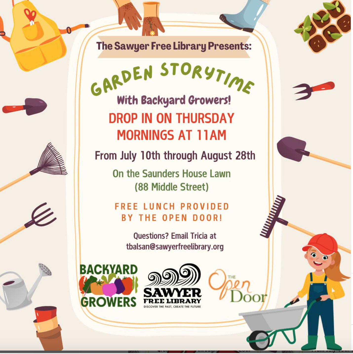 Join the Sawyer Free Library on Thursday mornings for Garden Storytime with Backyard Growerson the Saunders House lawn! Running this Thursday through August 28, the Library’s Garden Storytime is great for kids of all ages. Children will plan, plant, water, weed, maintain and harvest a garden at the library all summer, while sharing books and stories about gardening and the outdoors. Free lunch is provided for all children by The Open Door.