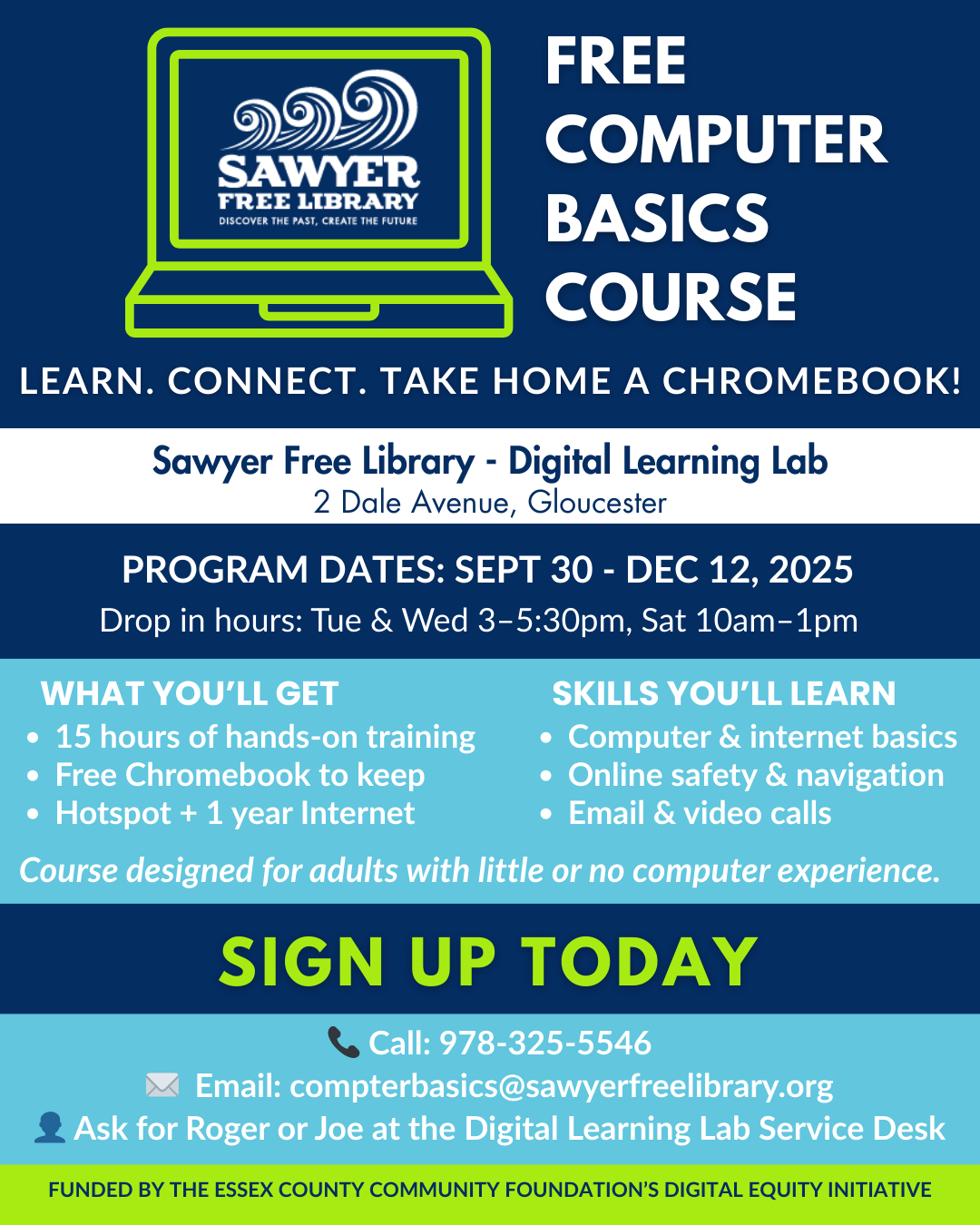 The Sawyer Free Library’s Digital Learning Lab is a new community resource dedicated to digital inclusion—offering approachable training, devices, and support to help Gloucester residents thrive in an increasingly online world.  The Computer Basics Course is supported through a generous Digital Equity Initiative Partnership Grant from the Essex County Community Foundation (ECCF).