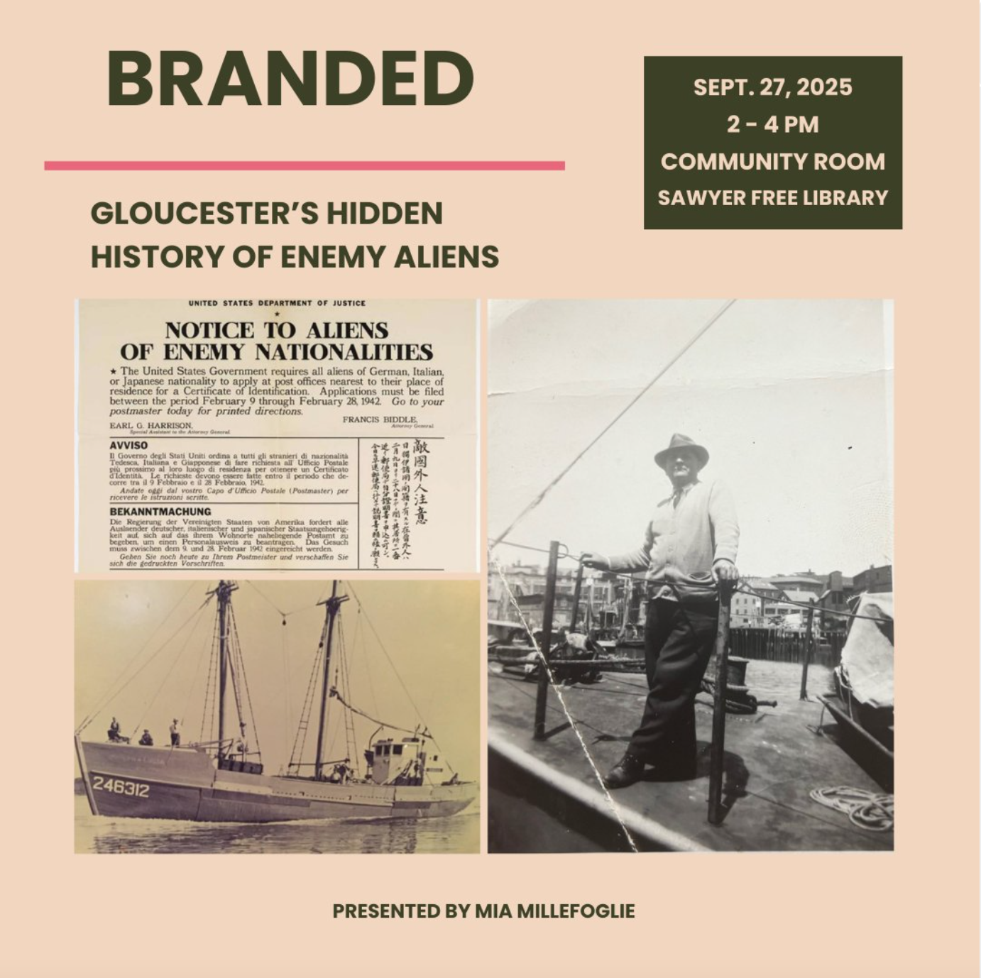 The Sawyer Free Library is proud to host Branded: Gloucester’s Hidden History of Enemy Aliens on Saturday, September 27 from 2:00 to 4:00 p.m. The event will take place in the Library’s (brand new!) Community Room located on the ground floor level.