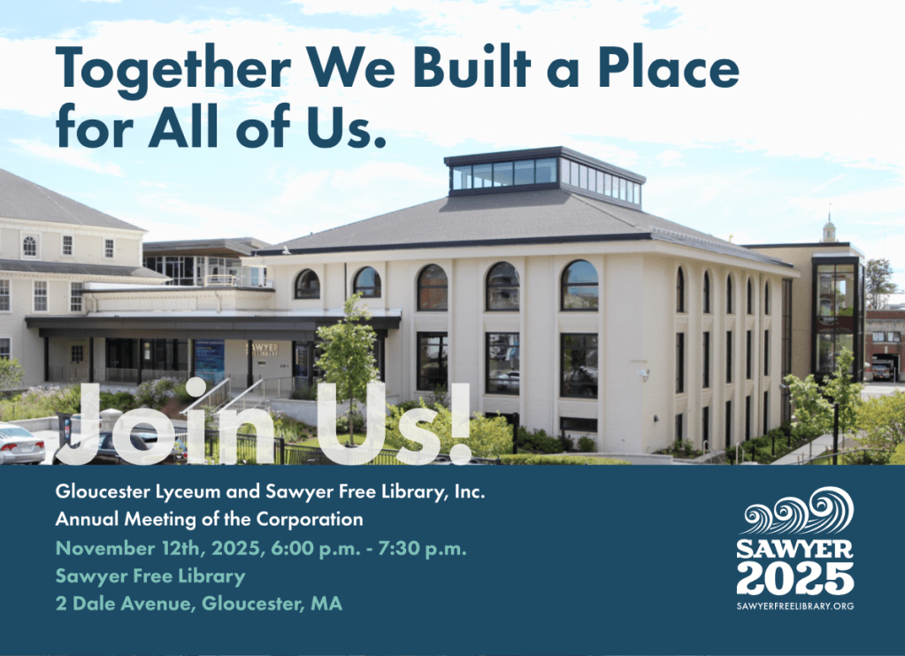 The Gloucester Lyceum and Sawyer Free Library Corporation will host its first Annual Meeting in the state-of-the-art Community Room of the newly expanded and modernized Library on Wednesday, November 12. The evening will feature remarks from Board President Mern Sibley, Mayor Greg Verga, and MBLC Commissioner Joyce Linehan, who will speak on standing up for libraries and intellectual freedom. Library Director Jenny Benedict will share highlights from this milestone year and a look ahead to the Library’s next chapter.