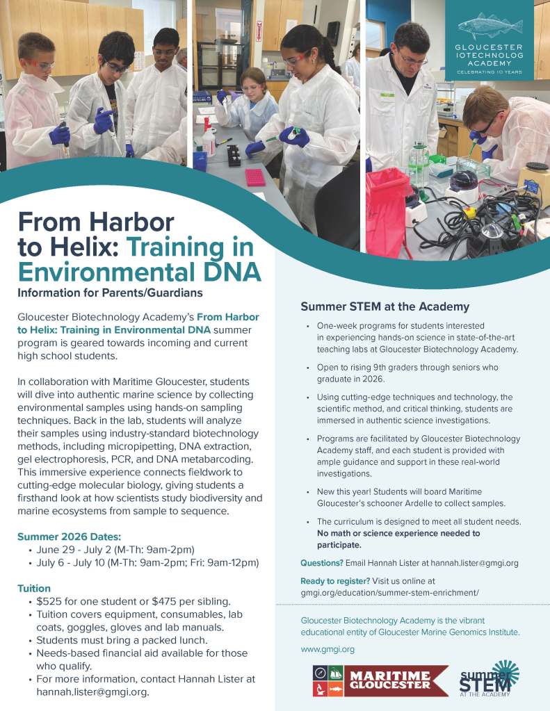We are thrilled to announce that this year, we are partnering with Maritime Gloucester for our new program, From Harbor to Helix: Training in Environmental DNA. During this one-week course, students will dive into authentic marine science by collecting environmental samples using hands-on sampling techniques. Back in the lab, students will analyze their samples using industry-standard biotechnology methods, including micropipetting, DNA extraction, gel electrophoresis, PCR, and DNA metabarcoding. This immersive experience connects fieldwork to cutting-edge molecular biology, giving students a firsthand look at how scientists study biodiversity and marine ecosystems from sample to sequence.