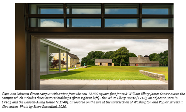 The Cape Ann Museum, founded in 1875, exists to preserve and celebrate the history and culture of the area and to keep it relevant to today’s audiences. Spanning 44,000 square feet, the Museum is one of the major cultural institutions on Boston’s North Shore welcoming more than 25,000 local, national and international visitors each year to its exhibitions and programs. In addition to fine art, the Museum’s collections include decorative art, textiles, artifacts from the maritime and granite industries, three historic homes, a Library & Archives and a sculpture park in the heart of downtown Gloucester. In Summer 2021, the Museum will officially open the 12,000 square foot Janet & William Ellery James Center at the Cape Ann Museum Green. The campus also includes three historic buildings – the White Ellery House (1710), an adjacent Barn (c. 1740), and the recently acquired Babson-Alling House (c.1740), all located on the site at the intersection of Washington and Poplar Streets in Gloucester.