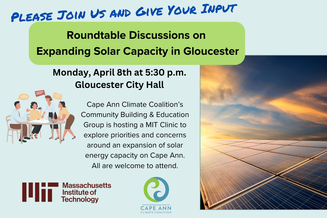 Weigh in with your thoughts and perspectives on local solar. The Cape Climate Coalition (CACC) and the MIT Renewables Clinic are co-hosting a public roundtable discussion at Gloucester City Hall on Monday, April 8 at 5:30 p.m. All are welcome to attend and discuss the potential for developing new solar energy projects in Gloucester. This is a time to raise questions and express your initial reasons for why and where you would support or oppose new projects.
