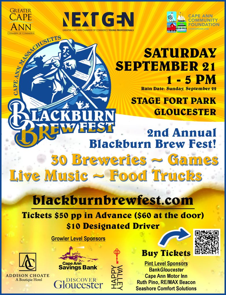 Get your tickets now for the 2nd Annual Blackburn Brew Fest on Saturday, September 21 at Stage Fort Park. Advance tickets are $50 per person (at-the-door purchase price is $60). Designated Driver tickets are also available at $10. Brews, hard ciders, food trucks, music, and games, all in beautiful Stage Fort Park overlooking Gloucester Harbor.