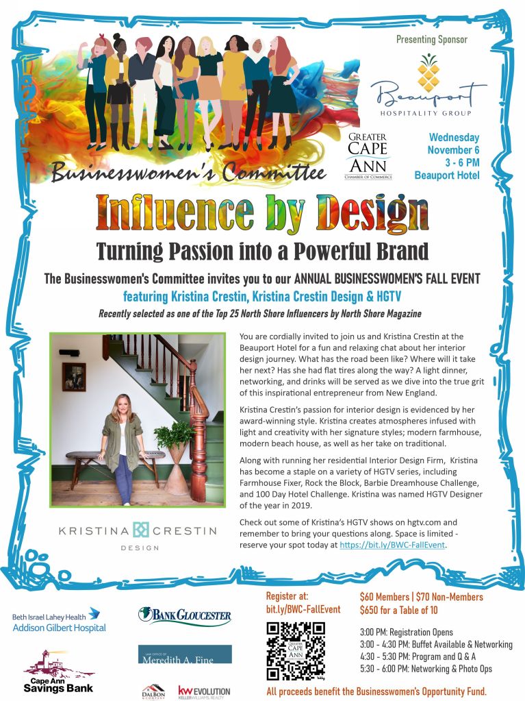 The Businesswomen’s Committee of the Greater Cape Ann Chamber invites you to our ANNUAL BUSINESSWOMEN’S FALL EVENT featuring Kristina Crestin, Kristina Crestin Design & HGTV!
