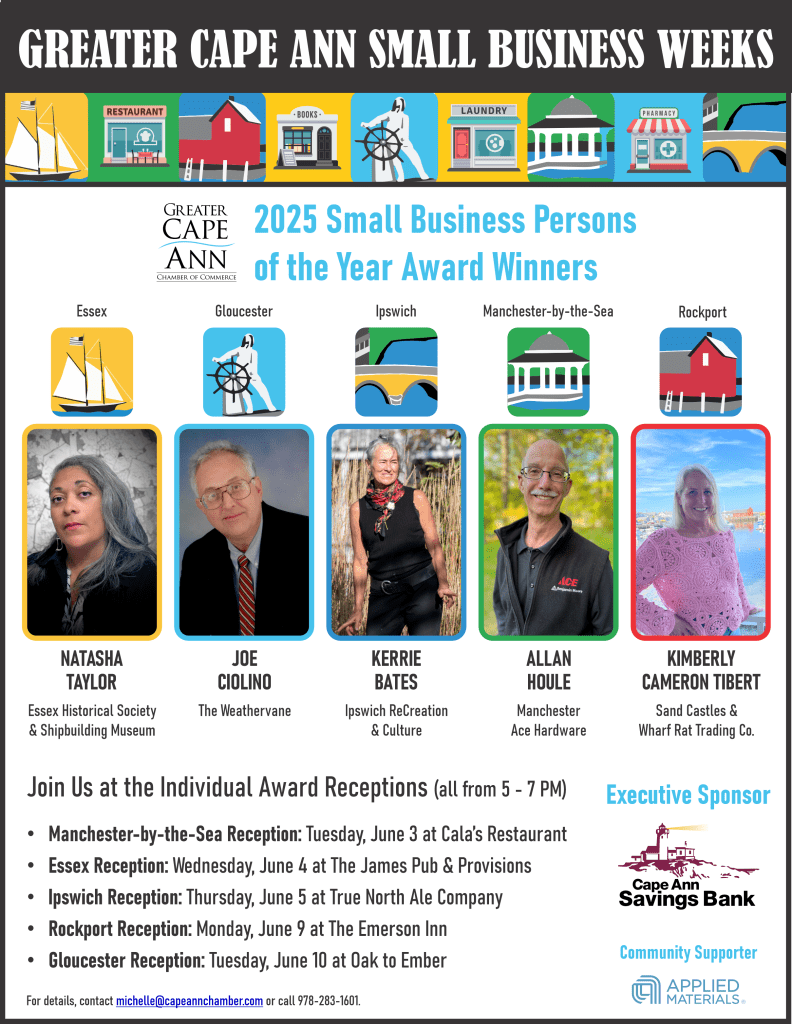 This year’s honorees include Allan Houle, owner of Manchester Ace Hardware (Manchester-by-the-Sea); Kimberly Cameron Tibert, owner of Sand Castles & Wharf Rat Trading Co. (Rockport); Joe Ciolino, owner of The Weathervane (Gloucester); Natasha Taylor, Office Manager of the Essex Historical Society & Ship Building Museum (Essex); and Kerrie Bates, Director of ReCreation and Culture (Ipswich). Each small business person of the year will be honored throughout the weeks of June 2-13 via the Chamber’s social media, websites, and email communications. The honorees will also receive a special citation from their respective local government at their individual ceremony.