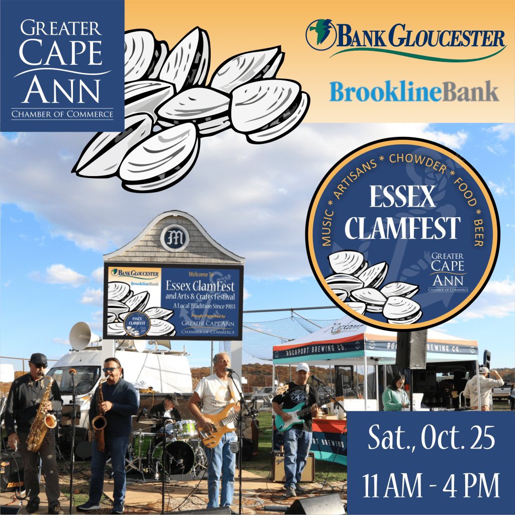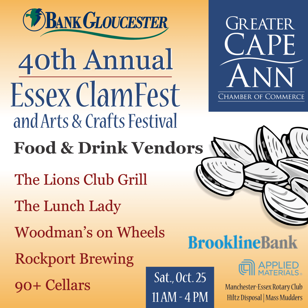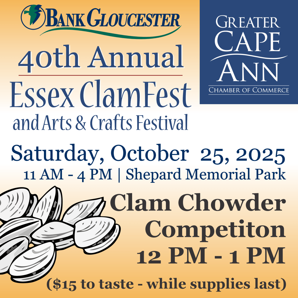 On Saturday, October 25, the 40th Annual Essex ClamFest and Clam Chowder Competition will return. This beloved fall event will feature over 40 Artist and Vendor booths, plus 15 Non-Profit Booths, a K-9 demonstration, Kids’ Activities, including the Cape Ann Vernal Pond Team, and Face Painting by Miss Wendy, live music, food vendors, Rockport Brewing Company, 90+ Cellars Wine Cellars and, of course, the ever-popular Clam Chowder Competition. The festival is free to attend and will take place at Shepard Memorial Park in Essex from 11 AM to 4 PM.