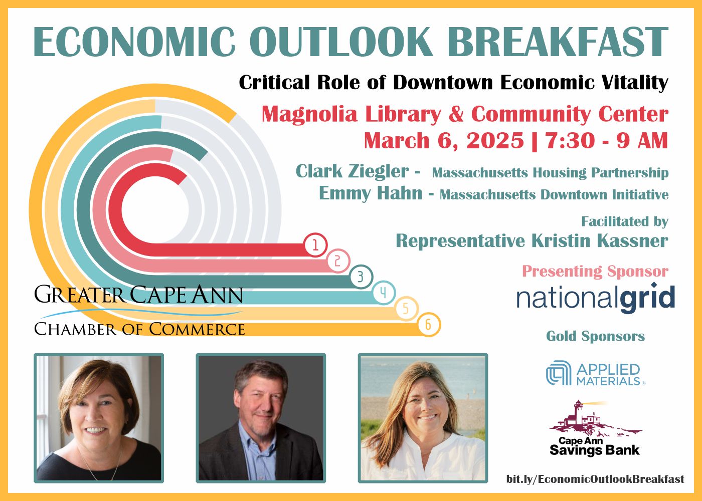 This year’s Economic Outlook Breakfast features expert panelists exploring the critical role of Downtown Economic Vitality and how it drives our local economy. The conversation will explore how a thriving business district can fuel economic growth and the importance of strategic planning to balance economic development with the growing need for affordable housing. We will explore strategies for how local businesses and municipalities can collaborate to drive positive change. Don’t miss this opportunity to gain valuable insights and connect with local leaders committed to a prosperous future for Greater Cape Ann.