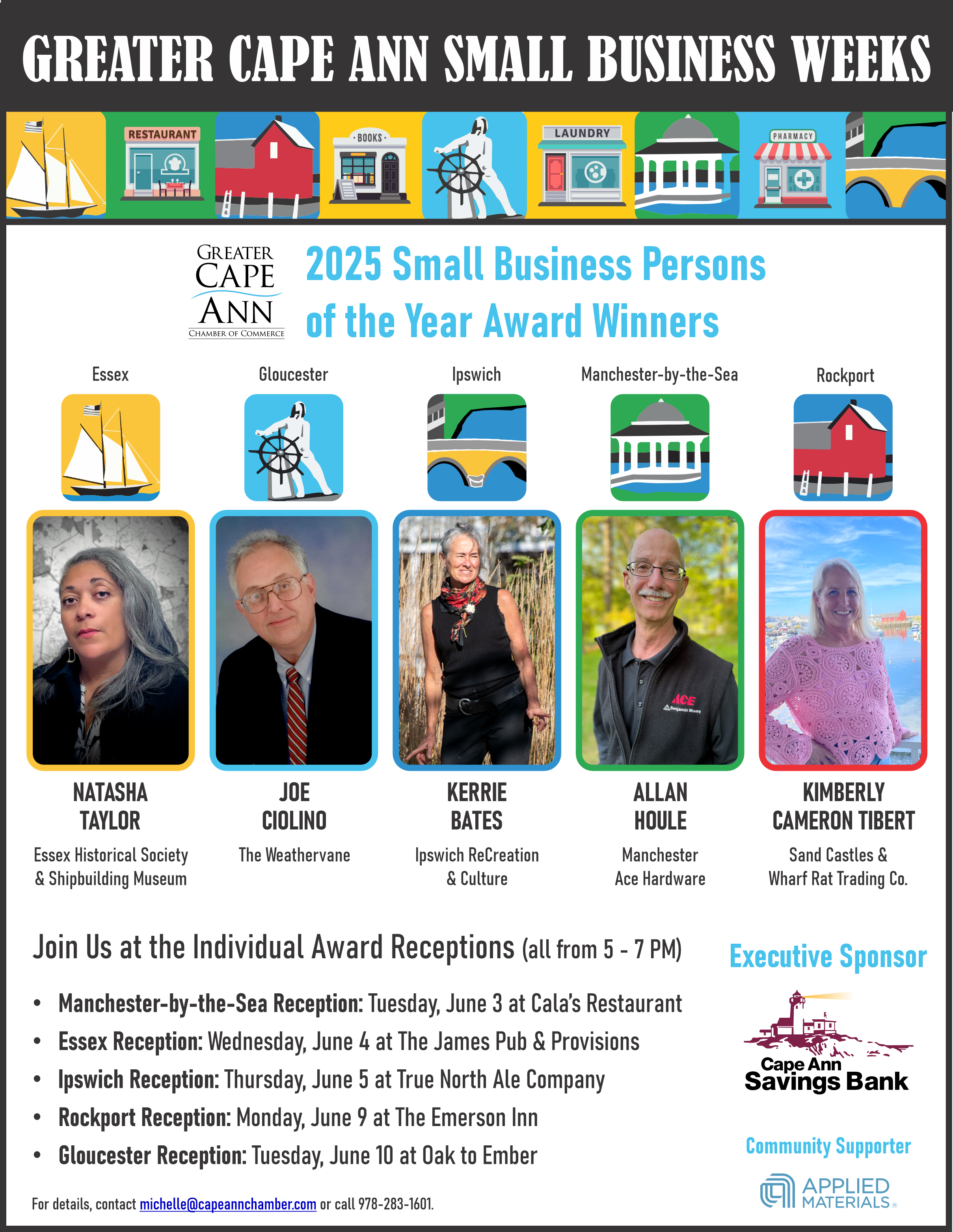 This year’s honorees include Allan Houle, owner of Manchester Ace Hardware (Manchester-by-the-Sea); Kimberly Cameron Tibert, owner of Sand Castles & Wharf Rat Trading Co. (Rockport); Joe Ciolino, owner of The Weathervane (Gloucester); Natasha Taylor, Office Manager of the Essex Historical Society & Ship Building Museum (Essex); and Kerrie Bates, Director of ReCreation and Culture (Ipswich). Each small business person of the year will be honored throughout the weeks of June 2-13 via the Chamber’s social media, websites, and email communications. The honorees will also receive a special citation from their respective local government at their individual ceremony.
