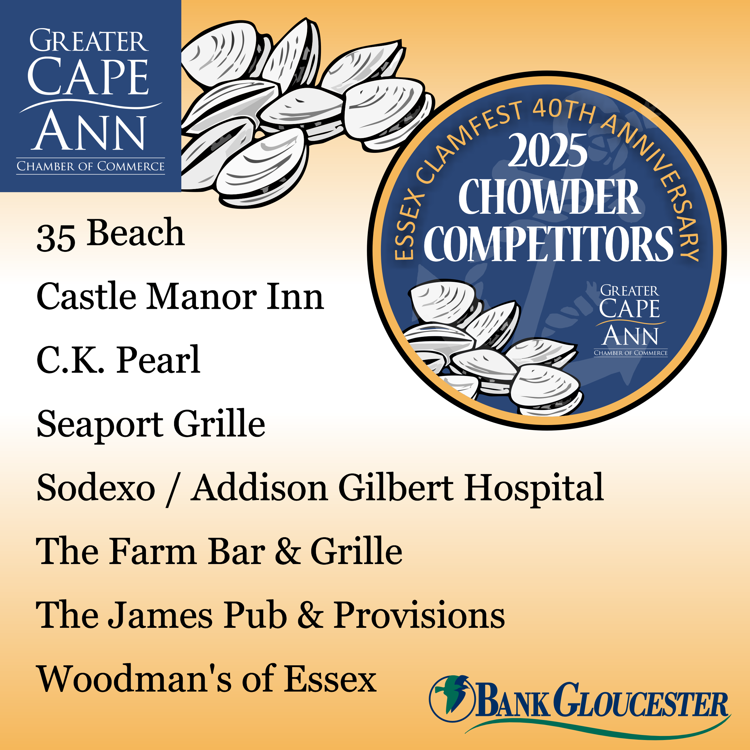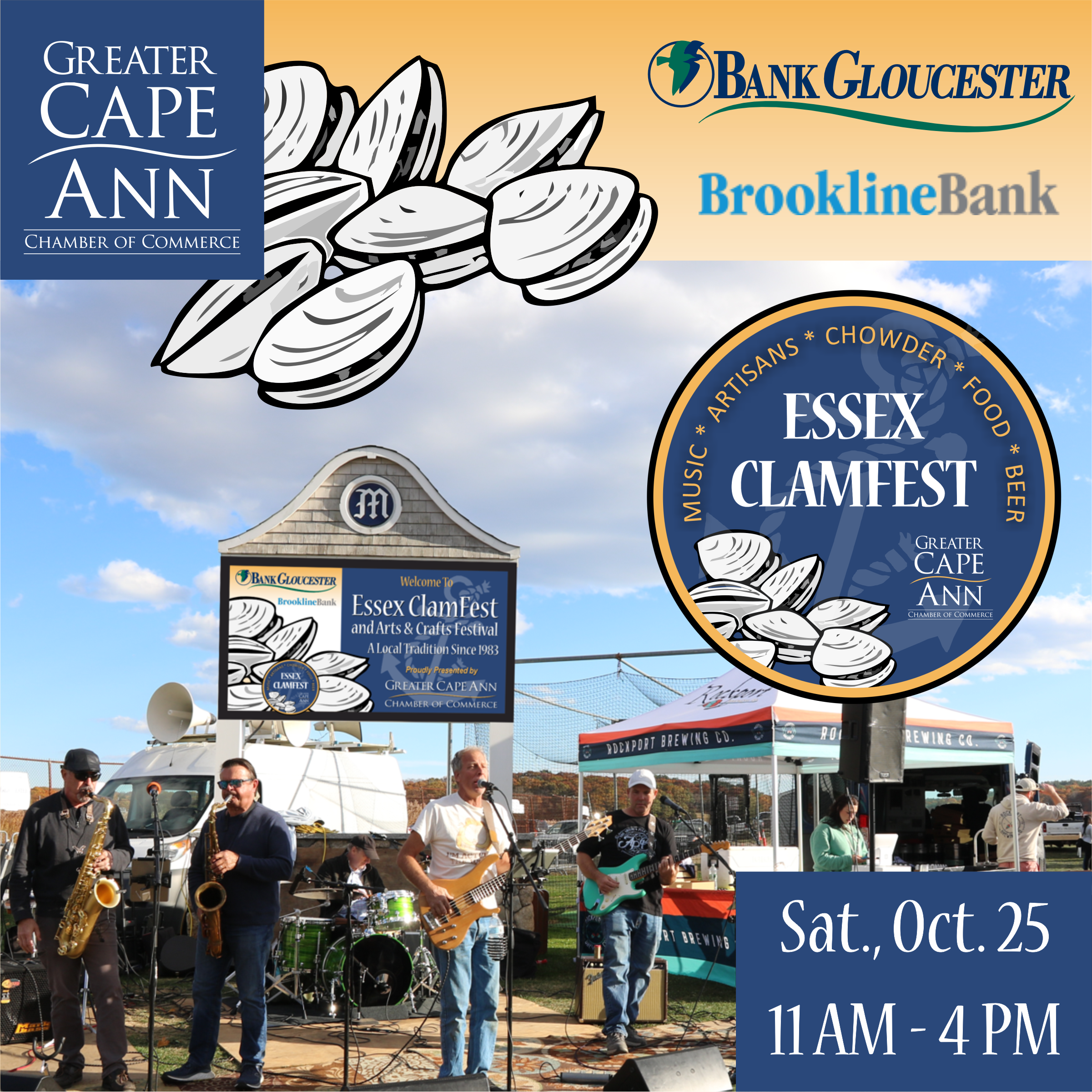 Essex Clamfest is produced by the Essex Division of the Greater Cape Ann Chamber of Commerce. BankGloucester is our Presenting sponsor; Brookline Bank is our Gold sponsor; Applied Materials is our silver sponsor, and Hiltz Disposal is our supporting sponsor.