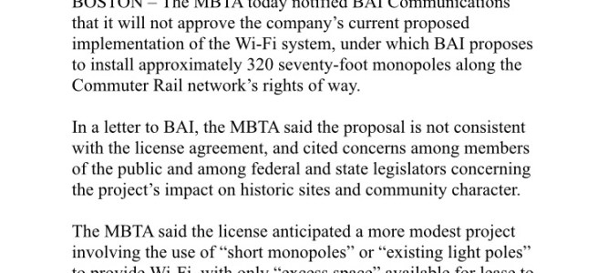 BOSTON – The MBTA today notified BAI Communications that it will not approve the company’s current proposed implementation of the Wi-Fi system, under which BAI proposes to install approximately 320 seventy-foot monopoles along the Commuter Rail network’s rights of way.