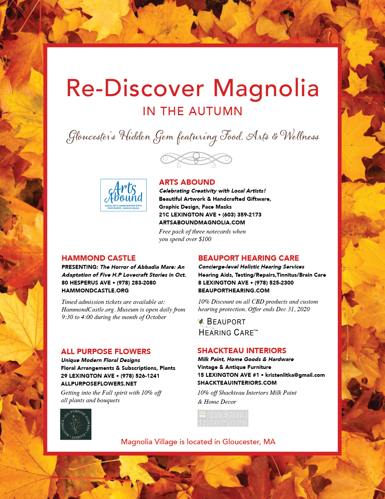 In collaboration with the Cape Ann Chamber of Commerce, the businesses on Lexington Ave in Magnolia have come together to provide visitors and residents with special Fall savings. Magnolia offers wonderful places to eat, shop, in addition to health and wellness services. Don’t miss the opportunity to experience Fall in Magnolia, it is a must see destination!