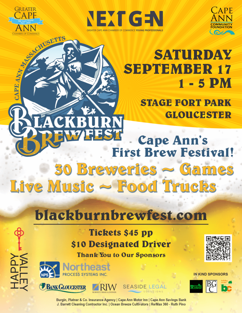 “We are so excited to bring the Blackburn Brew Fest to life in scenic Stage Fort park with so many great breweries, food trucks and Over the Bridge,” said Caitlin Pszenny, President of the Greater Cape Ann Chamber of Commerce, Next Gen chair and co-owner of Cape Ann Lanes/Laneside Pub & Brewery. “Next Gen has been planning the brew fest for a few years, but it was delayed by the pandemic. We look forward to a fun-filled day and are grateful for the support from the amazing Chamber team, the NEXT GEN committee and our brew fest leads Chris Griffith of Gloucester Stage and Charlie Powers of Burgin, Platner & Co. Insurance Agency.”