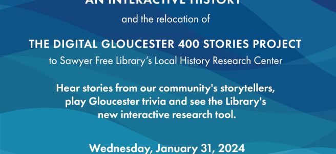 Please join the Sawyer Free Library and the Gloucester 400+ on Wednesday, January 31 from6:30 to 8:00 p.m. at the Beauport Hotel Gloucesterto celebrate the launch of theGloucester Timeline: An Interactive History and the relocation of the digital Gloucester 400 Stories Projectto the Library.