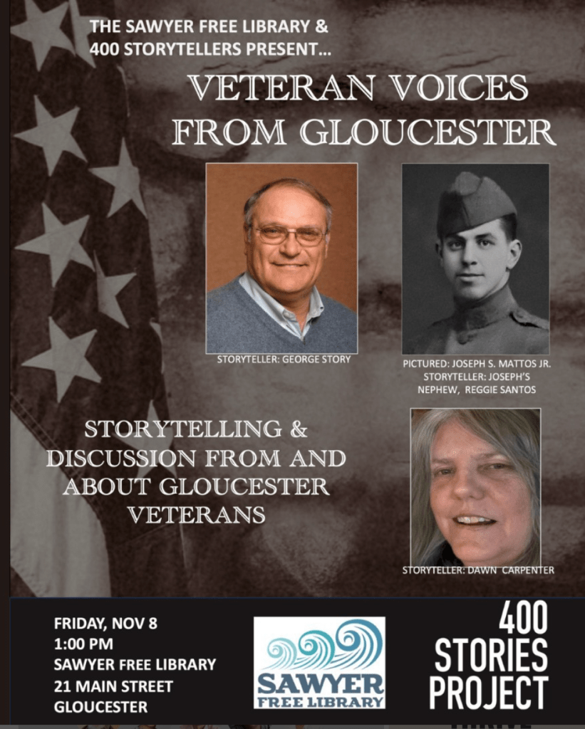 Please join the Sawyer Free Library at 21 Main Street in downtown Gloucester on Friday, November 8 from 1:00 to 3:00 pm for a very special 400 Storytellers Event featuring Captain George Story, Dawn Carpenter, and Reginald Santos as they share and discuss Veteran-themed stories. Light refreshments will be served.