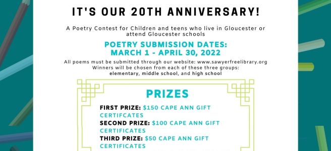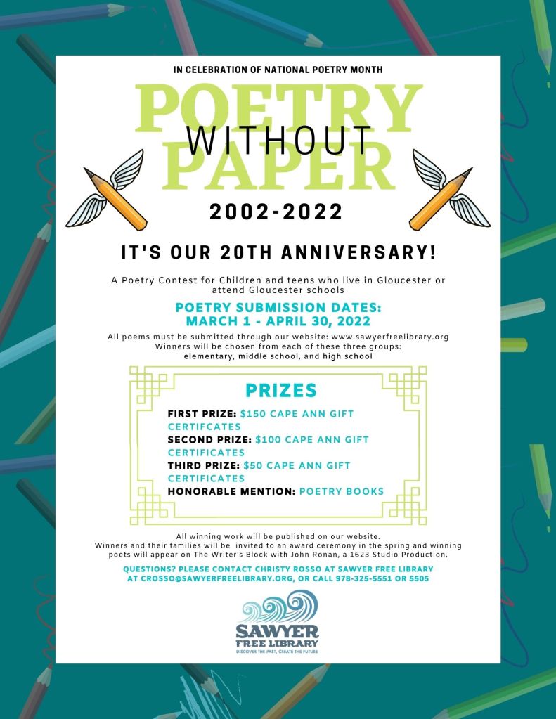 To mark the celebration of 20 years, Sawyer Free Library has made the Poetry without Paperprizes even more exciting. Winners will be chosen from each age group: high school, middle school, and elementary school. First-place winners in all categories receive $150 Cape Ann gift certificates, second-place winners receive $100 gift certificates, and third-place winners receive a $50 gift certificate with Honorable Mention awarded a poetry book. All winning poets receive a certificate, present their poems at a Spring awards ceremony and receive an invitation to appear on 1623 Studio’s production, The Writer’s Block with John Ronan. All winning work will also be published online by the Library.