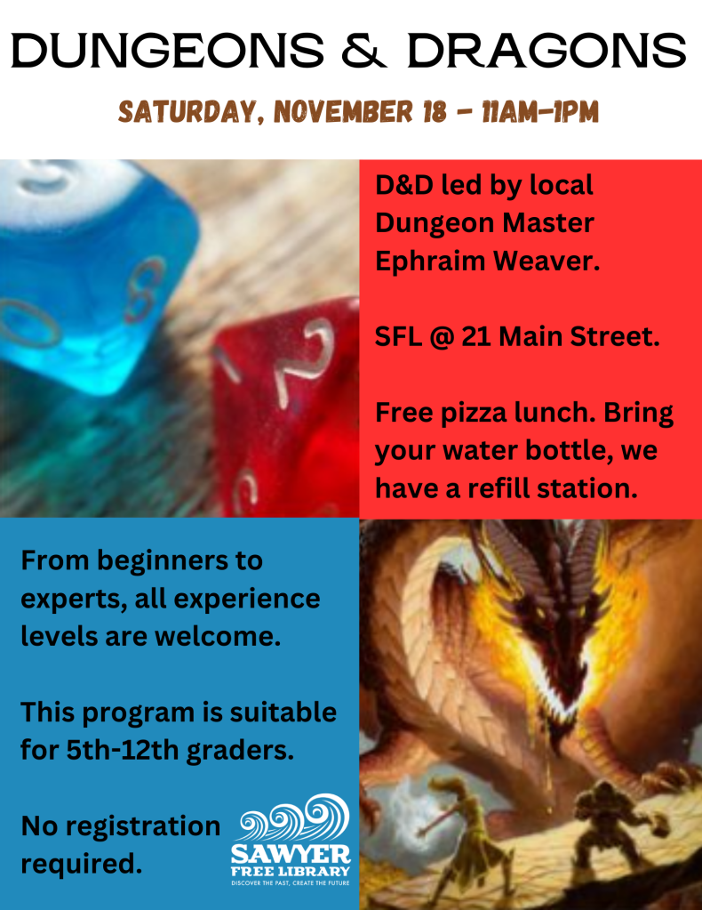 Join us for a 3-hour fantastical adventure at the Sawyer Free Library this Saturday, November 18 from 11:00 a.m. to 1:00 p.m. with local Dungeon Master (DM) Ephraim Weaver. Beginner and experienced Dungeons & Dragons players in grades 5-12th graders are welcome! Pizza will be served. No registration necessary. Event at Sawyer Free Library located at 21 Main Street, Gloucester. For more information visit, SawyerFreeLibrary.org or 978-325-5500.